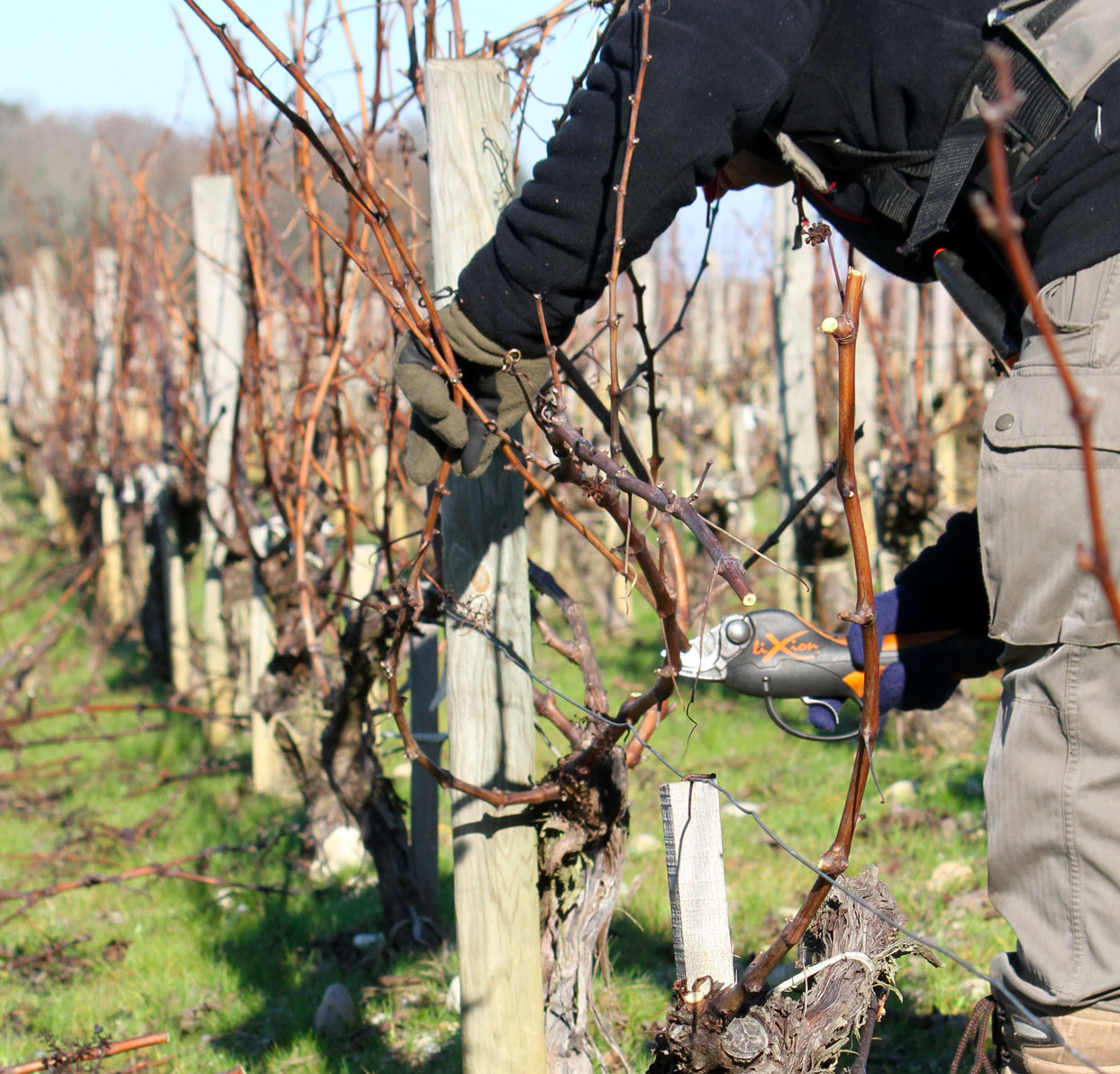 Taille, ébourgeonnage, pliage, relevage, épamprage, vendange verte, effeuillage, traitements raisonnés de mai à aout, la vie du Château Peyrabon est rythmée au gré des différents travaux suivant le cycle végétatif de la vigne.